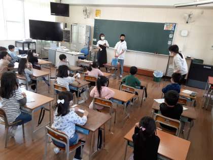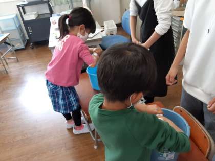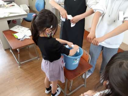 1年生にとって、机やいすを運ぶのは重く、ほうきやちりとりの使い方ひとつとってもなかなか難しいようです。特に難しいのが、ぞうきんの絞り方です。掃除が終わったお昼休みに、6年生が1年生に、ぞうきんの絞り方をやさしく丁寧に教えてくれていました。「そう、上手上手。」と励ましの声をかけてくれます。
