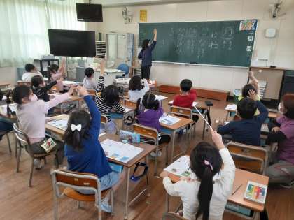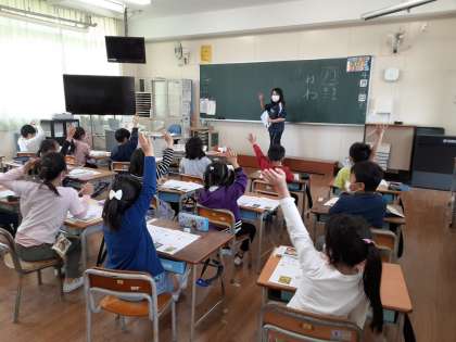 1年生では国語科で、ひらがなの学習が進んでいます。1組では先生から「ひらがなのお勉強が楽しい人?」と問いかけると、多くの児童が「はーい。」と手を挙げていました。一文字ずつ丁寧に練習するのか1年生にとって決して楽なことではありません。それでも、「楽しい」と感じて、目をキラキラさせて練習する姿はとても素敵に見えました。