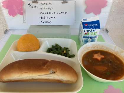 4月26日(月)の給食は、おさつぱん・牛乳・ビーフシチュー・さんどまめとコーンのサラダ・あまなつかんです。ビーフシチューに使われているルウは、小麦粉を油で色がつくまで炒めて作り、ブラウンルウと言います。シチューなどのとろみをつけるために使います。ビーフやにんじん・じゃがいもなどがたっぷり入っていて、とろとろの美味しいシチューです。ラッキーにんじんが入っているかもしれません。