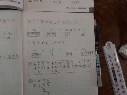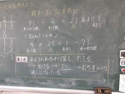 「たてる」⇒「かける」⇒「ひく」⇒「おろす」 公開日 2021/04/27 更新日 2021/04/27 お知らせ 4年生の算数の授業が進んでいきます。筆算のやり方を考えていくうちに、前時までに習った筆算の仕方と、基本的には変わらないことがわかってきました。「たてる」⇒「かける」⇒「ひく」⇒「おろす」この繰り返しです。計算間違いをしないように、位をそろえるように、あまりがわる数より大きくならないように、いくつもの問題を練習して、計算力を定着させてほしいです。 いいね(0)