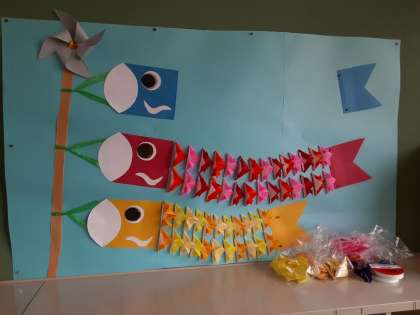 6年生は、5月の掲示を児童と一緒に作っています。こいのぼりのうろこは、よく見るとかぶとです。周りには藤の花を敷き詰める予定で、児童に藤の花を作るのを手伝ってもらいます。素敵な掲示ができると思います。