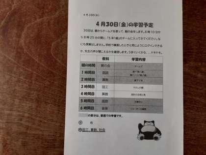 4月30日(金)朝、つながりましょう 公開日 2021/04/28 更新日 2021/04/28 お知らせ 5年生では端末で双方向通信できるように調整していました。4月30日(金)朝の会をTeamsで行います。みなさん、しっかりつながってほしいと思います。 それから、予定表には、朝の会の後、1時間目は漢字ドリル・漢字ドリルノート、2時間目は算数プリントの課題があります。そちらも忘れずにお願いしますね。 いいね(0)