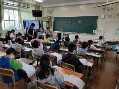 3年生は国語科で、新出漢字について学んでいました。今日の漢字は「落」と「開」のようです。漢字ドリルに書き順や読み仮名、練習が終わったら、挙手して先生に知らせます。正しく書けていなかったり、雑な書き方になっていたりしたら、先生が赤の採点ペンで修正します。児童は後で消して、丁寧になぞらなくてはいけません。