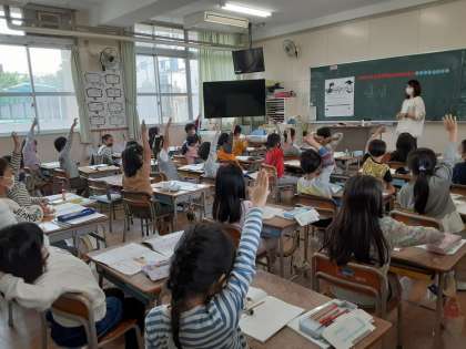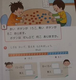 2年生では算数科で「たし算の きまり」を学習していました。下記のような問題で、「15+8」「8+15」両方の答えを比べて、わかったことを話し合っていました。先生から「わかったことはありますか?」の問いかけに、たくさんの児童が一斉に手を挙げていました。やる気に満ちています。