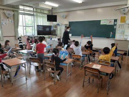 3・4時限目の授業以外はプリントやドリルでの学習が多いので、先生が丸付けして児童に返すドリルやプリントがどうしてもたくさんになってしまいます。1年2組でも、たくさんの配り物がありました。先生が「配ってほしい物がたくさんあります。配ってくれる人はいませんか。」と問いかけると、たくさんの児童から手が挙がりました。(写真を撮るタイミングが遅くなり、数人の児童が手を下ろしたところでの写真になってしまいました。実際は、もっと多くの児童が手を挙げていました。)