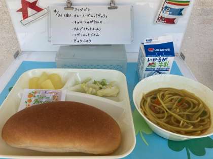 4月30日(金)の給食は、コッペパン・アプリコットジャム・牛乳・カレースープスパゲッティ・キャベツのピクルス・りんご(缶)です。キャベツにはビタミンCやビタミンKなどの栄養素が多く含まれています。ビタミンCは、体の抵抗力を高め、病気の予防に役立ちます。ビタミンKは、骨を作るために必要なビタミンです。キャベツの甘酸っぱい味付けが、カレースープを食べた後の口の中をさっぱりさせてくれます。