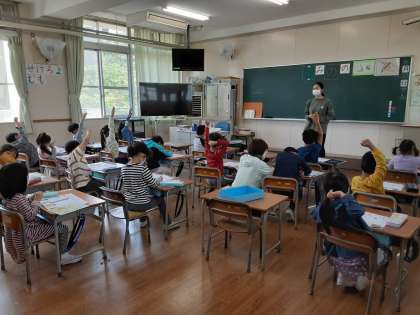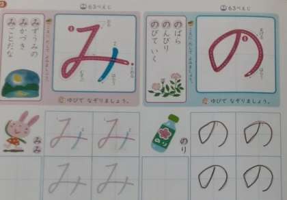 1年生は国語科でひらがなを学習しています。まずは「の」と「み」から学びます。先生が「『み』の字です。2画目の終わりは、どの部屋になりますか?」と問いかけると、たくさん手が挙がり「4の部屋です。」の答えがありました。字の形を丁寧に書くにあたり、「〇画目は、△の部屋からははじまり、□の部屋で終わる。」そこまで、気をつけられるようになってきました。