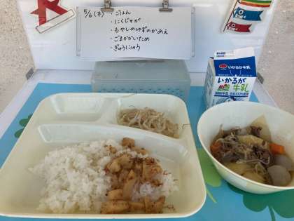 5月6日(木)の給食は、ごはん・牛乳・肉じゃが・もやしのゆずの香あえ・ごまかかいためです。肉じゃがは、料理酒で下味をつけた牛肉に、にんじん・たまねぎ・茹でた糸こんにゃくの順に炒めてから、じゃがいもとだしを加えて煮ます。じゃがいもが半ば軟らかくなってから、味つけをして煮含めます。肉じゃがには、たくさんの具に囲まれ適度に軟らかくなったじゃがいもの美味しさが広がっています。