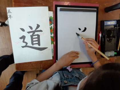 「道」 公開日 2021/05/06 更新日 2021/05/06 お知らせ 5年生では書写の時間に、毛筆で「道」を練習していました。毛筆で「しんにょう」は書きにくいようです。また、「首」の部分、横画を等間隔で書くのも、かなり意識しなければいけないようです。 手本には朱書きで「止め」「はらい」、そして、しんにょうのところで「なめらかに」「ぐっとはらう」と注意書きがされていました。みんな手本を見て、集中して書いていました。 いいね(0)