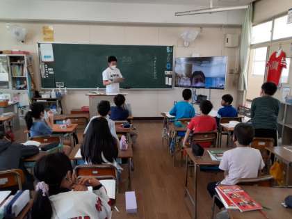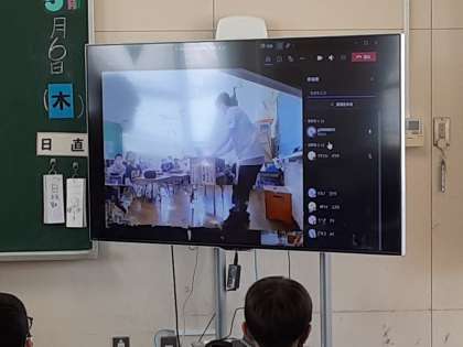 4年2組では、新たに「ピン止め」についての説明がありました。これができると、双方向通信の活用方法が広がります。先生の顔のアップが映ると「だれが『進撃の巨人』や」と先生自ら一人突っ込みしたり、「『9時30分』は朝からですか?」の質問に「夜でもいいよ。寝ながらしゃべろうか。」という切り返しがあったり、楽しい説明のひと時でした。