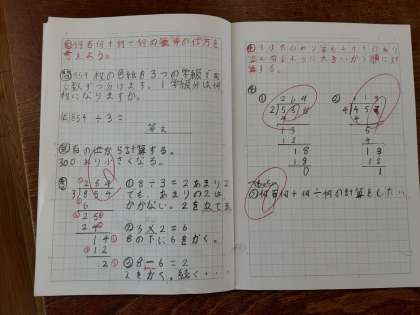 ノートに、計算する順序を番号で示して、わかりやすくきれいにまとめている児童がいました。自分だけがわかるのではなく、誰が見ても容易にわかるノートにまとめているのに感心しました。