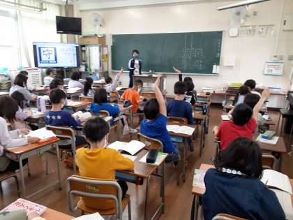 3年生は国語科で「すいせんのラッパ」を学習しています。本時では、「グローブみたいなかえる」が目を覚ましたのがわかる部分を抜き出して、どのように音読したいか考えていました。「『プップ・パッパ・パパラピープウー』の部分は、『楽しく元気に』『本当にラッパを吹いているように』『大きな声で』読む。「『はらへった。はらへった。すっぽこど、すっぽこ』の部分は、『本当にお相撲さんのような声で(こもったような声で)』読む。」など、いろいろな意見が出ました。