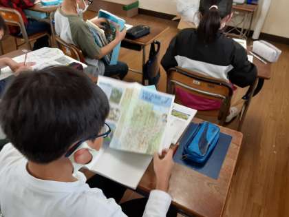 本時では、主に教科書の資料を使っていました。それでも、先生の問いに反応するように、副読本についている大阪府の絵地図を開こうとする積極的な児童もいました。