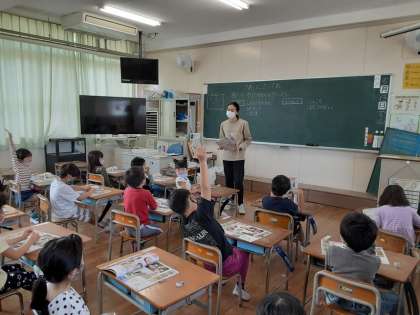 1年生は生活科で「きれいに さいてね」に取り組みます。2組では、いろいろな花の種を観察していました。ひまわりの種を見て「白と黒の線がある」「ピーナッツみたい」さらに「しまうまに似ている」というユニークな考えが出ました。ホウセンカの種を見て、「石ころみたい」よく観察しています。