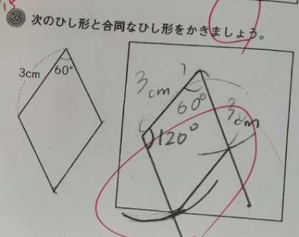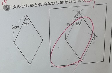 合同なひし形 公開日 2021/05/13 更新日 2021/05/13 お知らせ 5年生では算数科「合同な図形」テストの答え合わせをしていました。ちょうど「次のひし形と合同なひし形を描きましょう。」という問題を考えていました。 「最も上にある頂点から、60度を測って3cmの辺を……。」最も一般的な描き方でしょうか。それ以外にもいろいろ方法があるようです。「ひし形を上下2つの三角形に分けると、それぞれの三角形は……。」「四角形の内角の和は360度なので……。」 いいね(0)