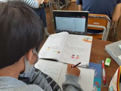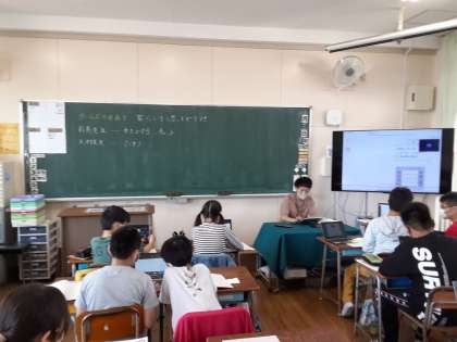 6年生は算数科で「文字と式」の学習をしています。この単元は机上に端末も置いて、Teamsでつながりながら学習を進めます。Teamsのめあては「家にいると思ってやる」です。学習内容だけでなく、Teamsの操作についても理解が進んでいるでしょうか。