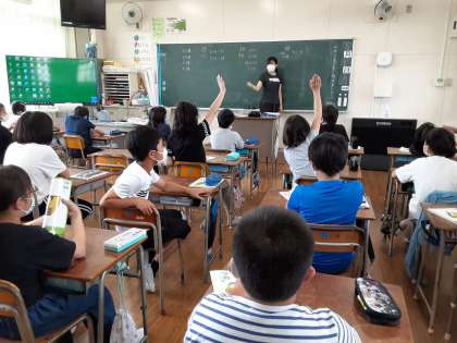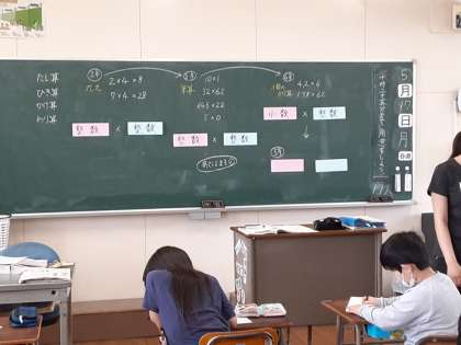 5年生では算数科でこれまで習ってきた「かけ算」について振り返っていました。2年生では九九を習い、3年生では筆算の仕方を習い、4年生では小数のかけ算について学んできたことを思い起こし、5年生のかけ算について意欲を高めていました。