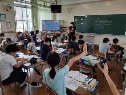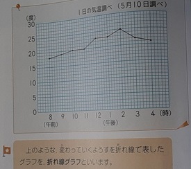 4年生、算数続きです。1日の気温の変化がわかりやすいように、折れ線で表す「折れ線グラフ」があることを知りました。折れ線の折れ方が「右上がり」「右下がり」「変わらない」によって、上がったり下がったり変わらなかったり、変化を表しています。その他にも、折れ線グラフから、いろいろな様子が読み取れるようで、子どもたちはいろいろな発見をしていました。