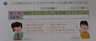 グラフや表に表そう1 公開日 2021/05/18 更新日 2021/05/18 お知らせ 4年生は算数科で「グラフや表に表そう」の学習をしています。1日の気温の変わり方の様子を調べる方法について考えていました。「表を使うとわかりやすいのではないか」「気温を高い順番に並べたらいいのではないか」などの見通しが出されていました。 棒グラフより、変化がわかりやすいグラフはないでしょうか。 いいね(0)