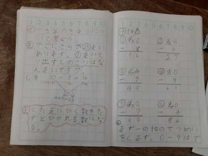 ひき算のきまり 公開日 2021/05/19 更新日 2021/05/19 お知らせ 2年生では算数科で「くりさがりのあるひき算」を学習しています。「こたえに引く数をたすと、引かれる数になる」ことを学びました。 次は、チャレンジ問題です。ひき算のひっ算を計算した後、その答えが正解なのかどうかを、このきまりを使って確かめます。指名された児童は、前に出て一所懸命説明していました。 いいね(0)