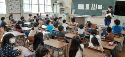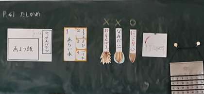 2年生は図画工作科で、絵の具の使い方について学習していました。黒板に3種類の筆が掲示されています。穂がばさばさの「おこりんぼう」筆は塗った麺がむらになります。水をつけすた「なみだ」筆は塗った後に水が垂れてきます。きれいな穂先で適度な水を含んだ「にっこり」筆ならきれいに塗ることができました。