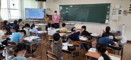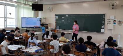 4年生は算数科で「グラフや表に表そう」の学習をしています。1組では、奈良とキャンベラ、2つの都市の気温の変化を表した折れ線グラフを比べて、わかったことを出し合います。
