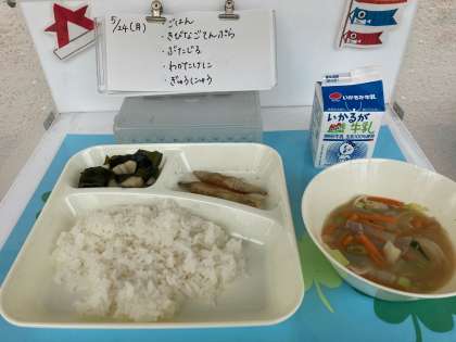 5月24日(月)の給食は、ごはん・牛乳・きびなごのてんぷら・豚汁・わかたけ煮です。きびなごは、体長10センチメートルくらいで、あたたかい海を好む魚です。春から初夏にかけて、卵を産むために日本の海岸近くにやってきます。このころのきびなごが一年で一番おいしい時期(旬)です。サクッとした衣に包まれて、中はふわっとしたきびなごの身がとても美味しいです。