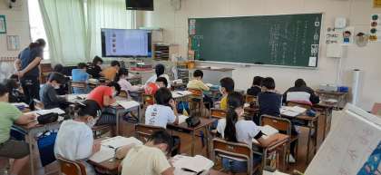4年1組では国語科で「ヤドカリとイソギンチャク」の学習をしていました。「ヤドカリは石に着いたイソギンチャクをどうやって自分の貝殻に移すのでしょうか。」先生の問いかけに対して、当てはまる文章を見つけ出すのですが、そのまま写すのではなく、内容をまとめる必要があります。「筆者が特に伝えたいのは、どの言葉なのか?」