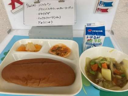 5月26日(水)の給食は、黒糖パン・牛乳・豚肉と野菜のカレースープ煮・変わりピザ・ミックスフルーツ(缶)です。本日のミックスフルーツで使われた缶詰には、国内産の黄桃・パインアップル・和なし・みかんが入っています。