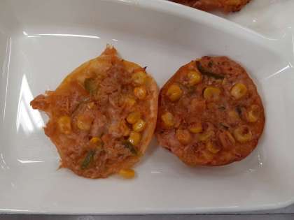 変わりピザは、ツナ・コーン・ピーマン・ピザソース・チーズを混ぜ合わせた具を、ぎょうざの皮にのせて焼きます。食べるときは一口ですが、給食調理員さんが1枚1枚手作りで作業しています。子どもたちにとって人気メニューのひとつです。