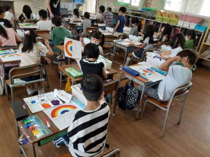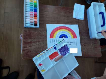 2年生では図画工作科で「ぼくの・わたしの作った虹」に取り組んでいます。前時に、絵の具の筆や水入れの基本的な使い方を学びました。本時では、3原色とその混色した色を使って、自分にしか作れない虹を塗っていました。運動場(パレットの最も広い部屋)で2種類の色を混色していました。子どもたちの目の色も、まるで混ぜている色につられるように好奇心で輝いていました。