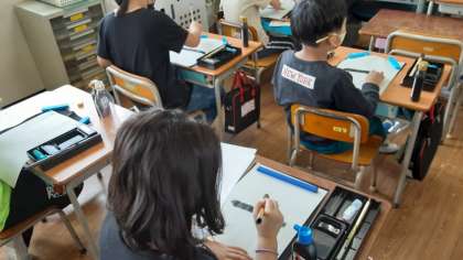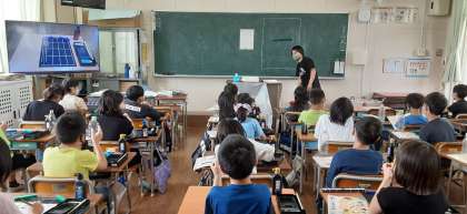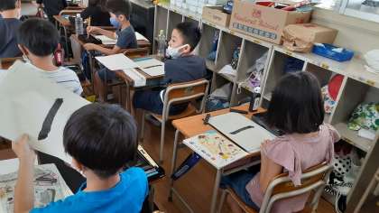 3年生は書写の授業で毛筆の学習が始まっています。新聞紙と洗濯ばさみを利用して、書き終わった半紙をまとめるようにしていました。また、本時から半紙の左端に「三年 〇〇」学年と名前を書き入れるようになります。小筆の使い方にも慣れていってほしいです。