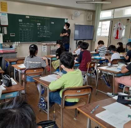 4年2組では算数科で「表とグラフにあらわそう」の学習をしていました。本時では、あゆむさんの年齢による身長の変わり方を折れ線グラフに表します。配られたグラフは、なぜか2種類ありました。どちらのグラフの方がわかりやすいのかを調べるようです。