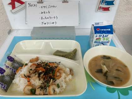 5月27日(木)の給食は、かやくご飯・牛乳・みそ汁・抹茶ういろうです。抹茶とは、材料となるお茶の葉を石うすで細かく粉状にしたものを言います。和菓子屋洋菓子、料理の材料などとしてよく使われます。今回は、ういろうを作る過程でよく混ぜ合わせ、抹茶の風味豊かな「ういろう」に仕上げています。ういろう本来の甘さと抹茶のほろ苦さが合わさって、とても美味しかったです。