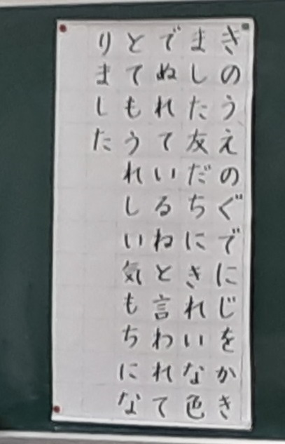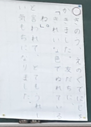 2年生では、国語科の授業が始まると先生が作文を読み始めました。だけど、子どもたちには、先生の音読が、あまり上手に聞こえなかったようです。どうしてなのか考えていました。『、』や『。』、「 」がついていないことが原因のようです。子どもたちは、句読点やかぎをつけなければいけない箇所を発表していました。その後、原稿用紙にどう書けばいいのかを話し合います。「最初に1マス空ける」という意見が出て感心しました。