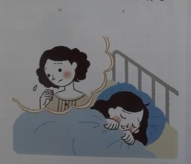 4年2組では道徳科で「目覚まし時計」の学習をしていました。わたしはお母さんからオルゴール付きの目覚まし時計を買ってもらい、最初は自己管理に活かしていました。でも、観たいテレビがあると「少しくらいいいじゃない」と思うように……。今朝は「うるさい目覚まし時計だ」と不機嫌に、小言を言うお母さんへもぷんぷんして登校しました。でも、学校で気分が悪くなり、気づくと保健室で横になってしまいました。