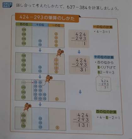 3年生では算数科で「ひき算のひっ算」について学習しています。「424−293」の筆算での計算の仕方について考えていました。繰り下がりがなければ大きな位から計算しても差し支えないようですが、この問題ではそうはいかないようです。