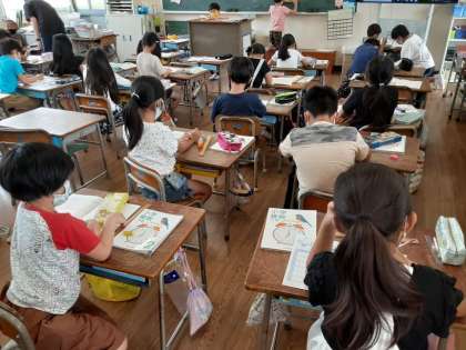 2年生は算数科で「長さ」について学習しています。本時では30cmさしを使って、身の回りの長さを測っていました。長さがどれくらいか予想を立ててから測ります。前時で先生から習ったように「5・10・15……。」と早速数えていました。「ほとんど一緒だった。予想と2mm違うだけだ。」思わず残念そうな声が漏れていました。