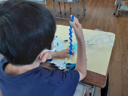 ちょきちょきかざり 公開日 2021/06/03 更新日 2021/06/03 お知らせ 1年生では図画工作科で「ちょきちょきかざり」を学習しています。1組では、折り紙を規則的に折ったり、重ねたりして、はさみで切ってみました。人の形・雪の結晶のような形など、素敵な飾りができて気ました。 色画用紙に並べると、飾りがよりいっそう目立って、美しい模様になります。できあがってみんなの作品を並べるのがとても楽しみです。 いいね(0)
