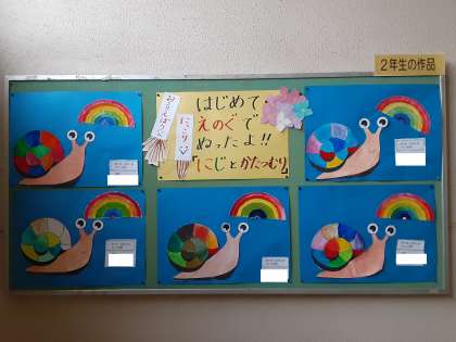 にじとかたつむり 公開日 2021/06/03 更新日 2021/06/03 お知らせ 2年生の掲示板に図画工作科で描いた「にじと かたつむり」の絵が掲示されていました。初めて絵の具で塗った作品です。上手に混色ができていました。 いいね(0)