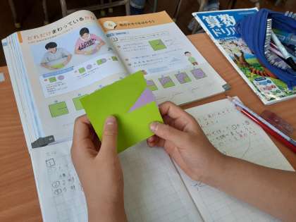 4年生では算数科で「角の大きさをはかろう」の学習が始まりました。円と正方形の紙にそれぞれ切り込みを入れて組み合わせると、下記のようにいろいろな角度をつくることができます。「角の開き具合のことを『角の大きさ』といいます。」新しい言葉が増えてきました。