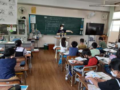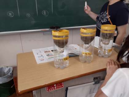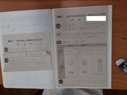 4年生では理科で「流れる水のはたらき」について学習しています。2組では、「校庭の土」「砂場の砂」「砂利」3種類に水を通して、それぞれ水のしみ込み方について調べていました。2リットルのペットボトルを改造して作った実験装置を観察しました。結構早くに結果は出たようです。ワークシートに結果やわかったことを書き込んでいました。