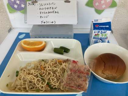 6月11日(金)の給食は、黒糖パン・牛乳・和風焼きそば・オクラの甘酢あえ・オレンジです。和風焼きそばは、塩味が効いて野菜のおいしさが引き立ちます。ソース焼きそばとは、違った美味しさが味わえます。
