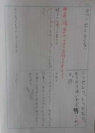 第2場面では、「弟のけんじの台詞が多い」という鋭い意見も出ましたが、中心人物のぶよの心の動きを主に考えます。毎年この教材では、親の気もちを少しでも感じ取ってもらえたらと思います。