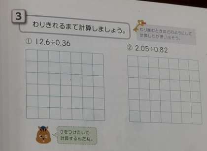 わり切れるまで計算しよう 公開日 2021/06/13 更新日 2021/06/13 お知らせ 5年生では算数科で「小数のわり算」について学習をしています。これまでわり算では、「わり切れるタイプ」「あまりが出るタイプ」「商を四捨五入するタイプ」などがありました。また「0をおろして計算していく、しつこいタイプ」があります。この「しつこい」という表現は、子どもたちの本音でしょうか。 本時では、わり切れるまで計算する方法について考えました。みんなわり切れるまで「しつこく」がんばっていました。 いいね(0)