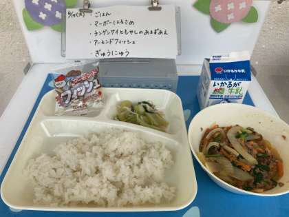 6月15日(火)の給食は、ごはん・牛乳・マーボーはるさめ・チンゲンサイともやしの甘酢あえ・アーモンドフィッシュです。はるさめは、じゃがいもやさつまいも、緑豆などのでん粉から作られます。給食では、ジャガイモのでんぷんで作られた「はるさめ」を使っています。マーボーはるさめは、豆板醤の味がはるさめにしっかり絡んでいます。ひき肉たっぷりでとても美味しかったです。