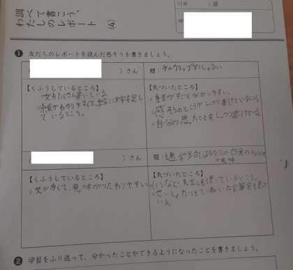 そして、お友だちのレポートを読んで「わかりやすく整理されているか」「考えが書かれているか」など感想をワークシートに書いていました。