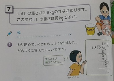 5年生では算数科で「小数のわり算」について学習しています。本時では下記の計算について考えます。この式のネーミングについて尋ねられると、「ずっと続く」「無限ループ」という声が返ってきました。児童にも、この式から「わり切れず、ずっと続きそうだ」という予想がつくようです。そんな場合どうするか、4年生で便利な方法を習ったのを思い出しました。