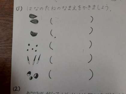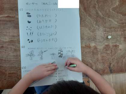1年生では生活科で、春の植物や昆虫について学習しています。ワークシートで、これまでの復習をしていました。生活科で5種類の種を植えましたが、下記の問題を解きながら「これ、何の種だったかな?」という声が聞こえてきそうでした。