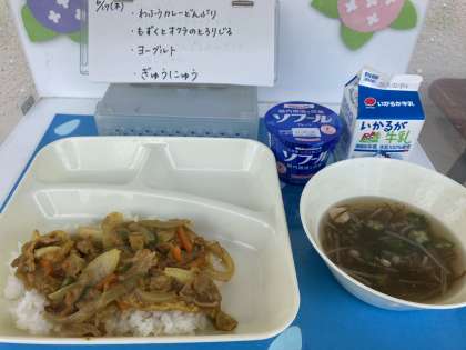 6月17日(木)の給食は、和風カレー丼・牛乳・もずくとオクラのとろり汁・ヨーグルトです。もずくは、ホンダワラなどの海そうにくっ付いて育ちます。「藻に着く」から「もずく」と呼ばれるようになりました。もずくは、1〜3月頃にとれます。もくずとおくらの効果で2倍のとろとろ・ねばねば食感が楽しめます。